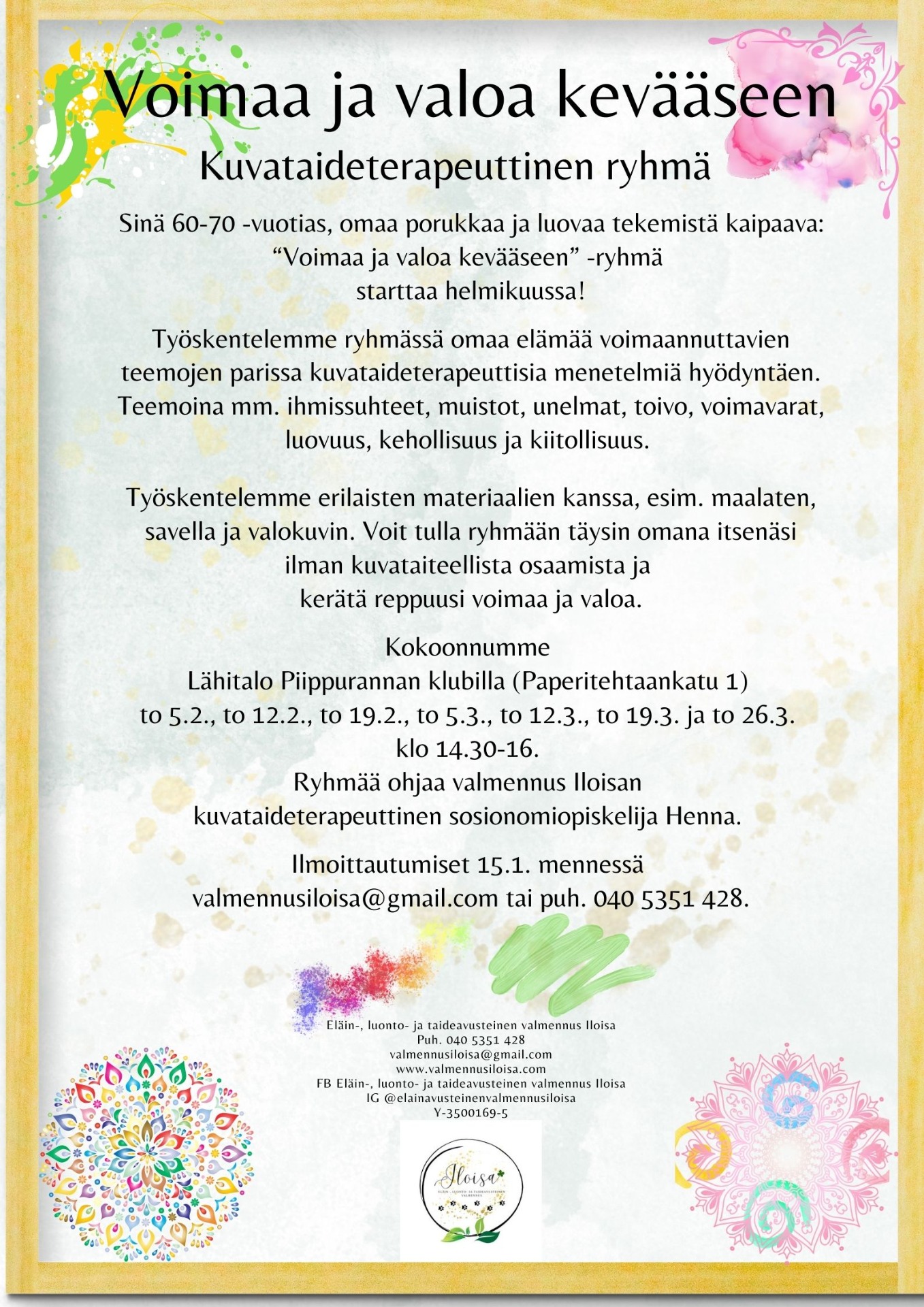 Helmikuussa starttaa Lähitalo Piippurannan klubilla 60-70 -vuotiaiden kuvataideterapeuttinen ryhmä "Voimaa ja valoa kevääseen"! Jos kaipaat itse tai tiedät jonkun, joka voisi ilostua kuvataiteen voimaannuttavasta vaikutuksesta, niin laitahan meille sähköpostia tai puhelua. Ryhmään voi tulla aivan omana itsenään, ilman minkäänlaista kuvataiteellista...